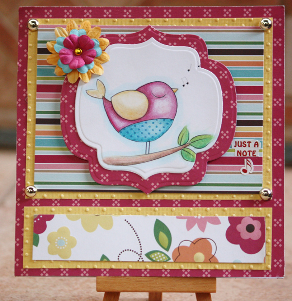 I used this great sketch from A Gem of a Challenge, turning it 90 degrees. It's not totally symmetrical, so I've really gone out on a limb, lol. Sweet Stampin' has Something Old & Something New as it's challenge theme, the stamp is old...or is it new if you haven't used it before? and the yellow flower is new, it was white and I coloured it with Copics to match the DCWV Bright Mat Stack card (embossed with Cuttlebugs Swiss Dots folder) used to mat the DPs . The centre of the flower is a brad that even predates my card making; I bought them for some other craft project yonks ago. Digital Tuesday Flower Power as its theme so my card is going there too.The Crafty Pad has Bold and Bright or Pretty Pastels as its challenge theme, I think this qualifies as Bold and Bright! My Time to Craft and Moving Along With The Times both have Here Comes the Summer as their theme this time around, the bright colours and singing bird are testament to that, so I'm entering there.