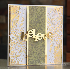 The "white" paper isn't white, it has almost a self-pattern on it, very nice IRL. The border die is "Poinsettia Edger" from Creative Expressions, the "Joy" is a die I got from Aliexpress, cuts really nicely - which isn't always the case with gold card :-)I popped the word up on more foam dots, well cut up bits of foam dots, lol
